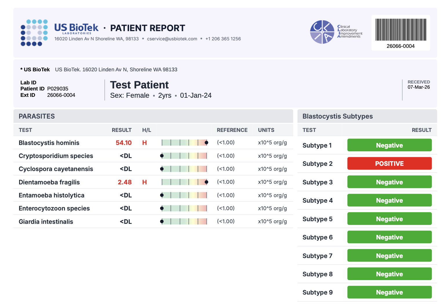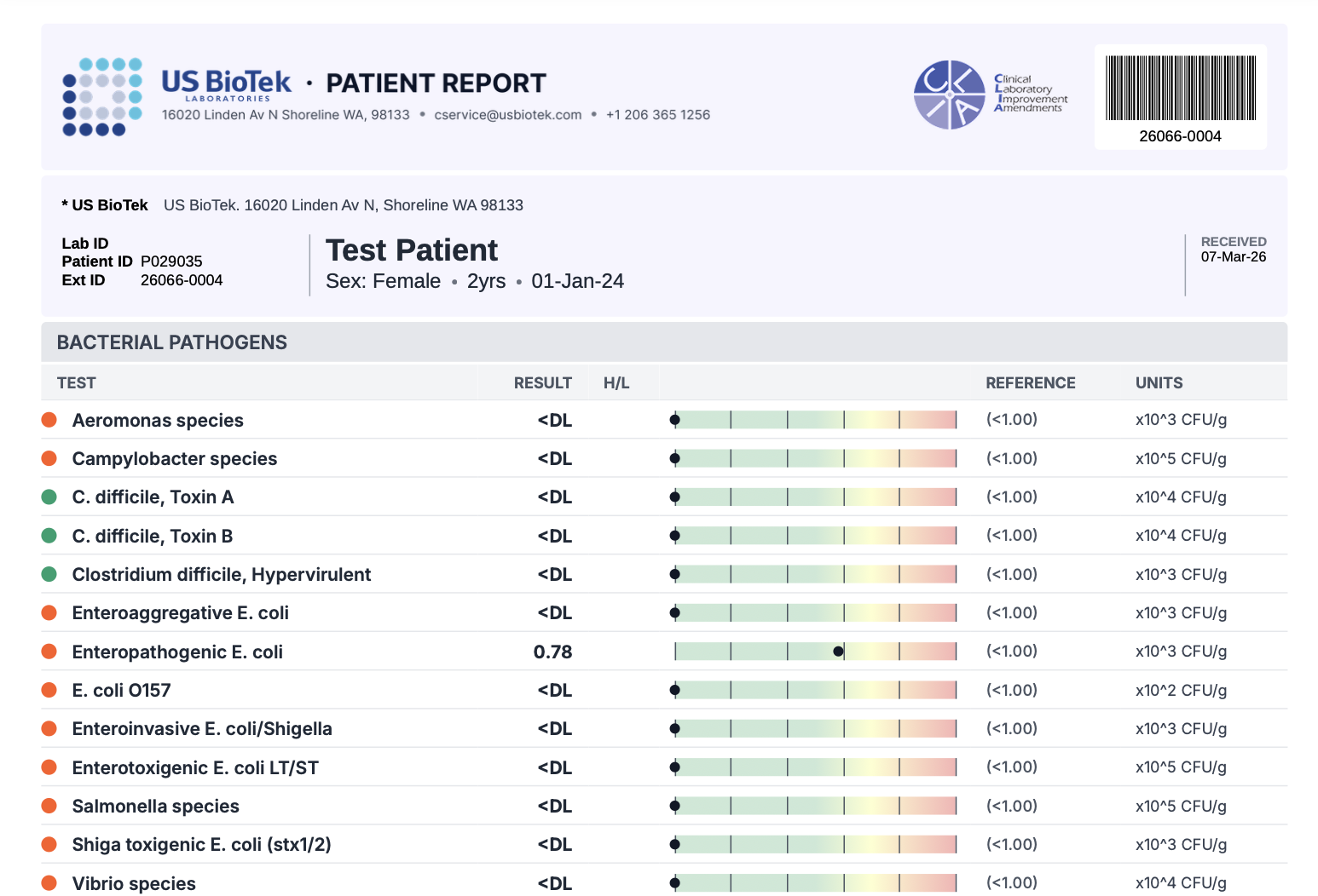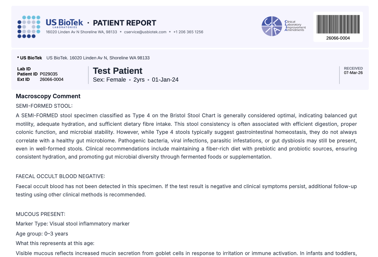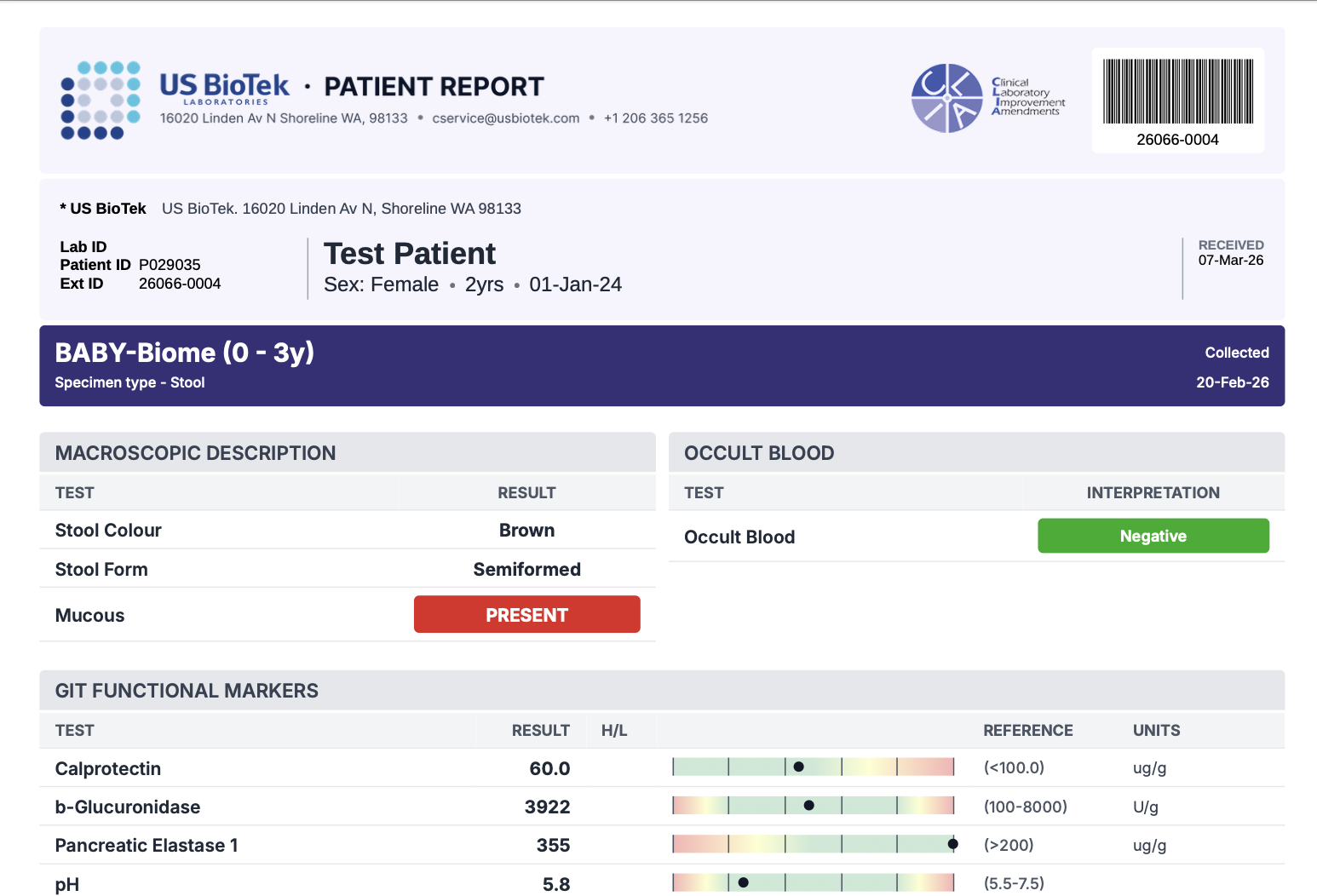 The BabyBiome Profile is a comprehensive stool analysis designed for infant and toddler populations. By combining PCR and metagenomic (shotgun) sequencing technologies, it provides a broad view of overall gut health, paired with commentary that is catered to their age range.