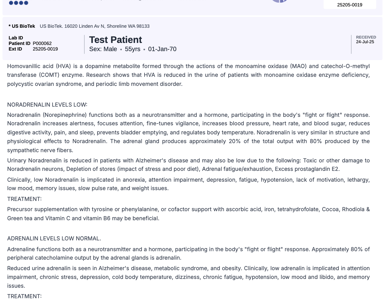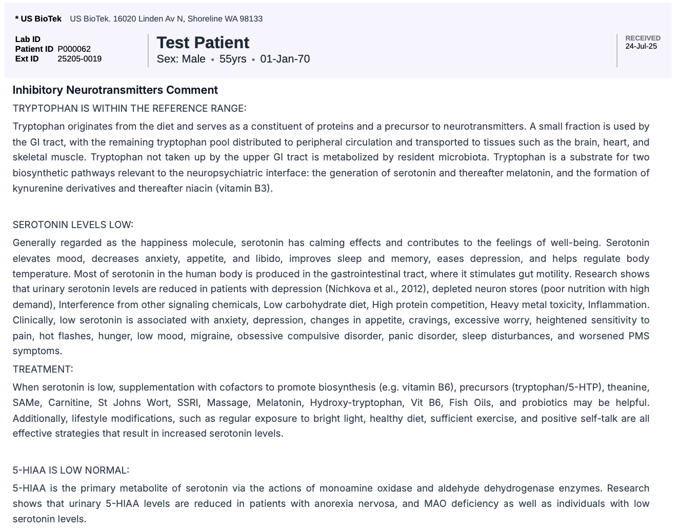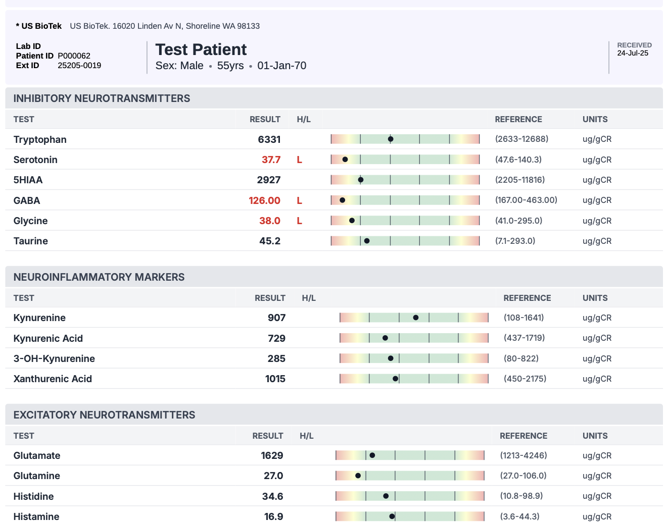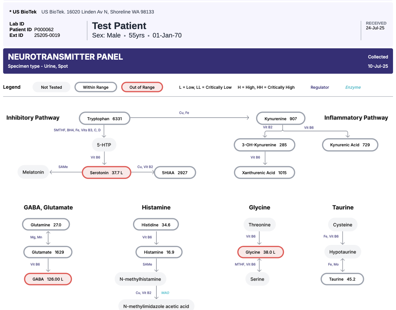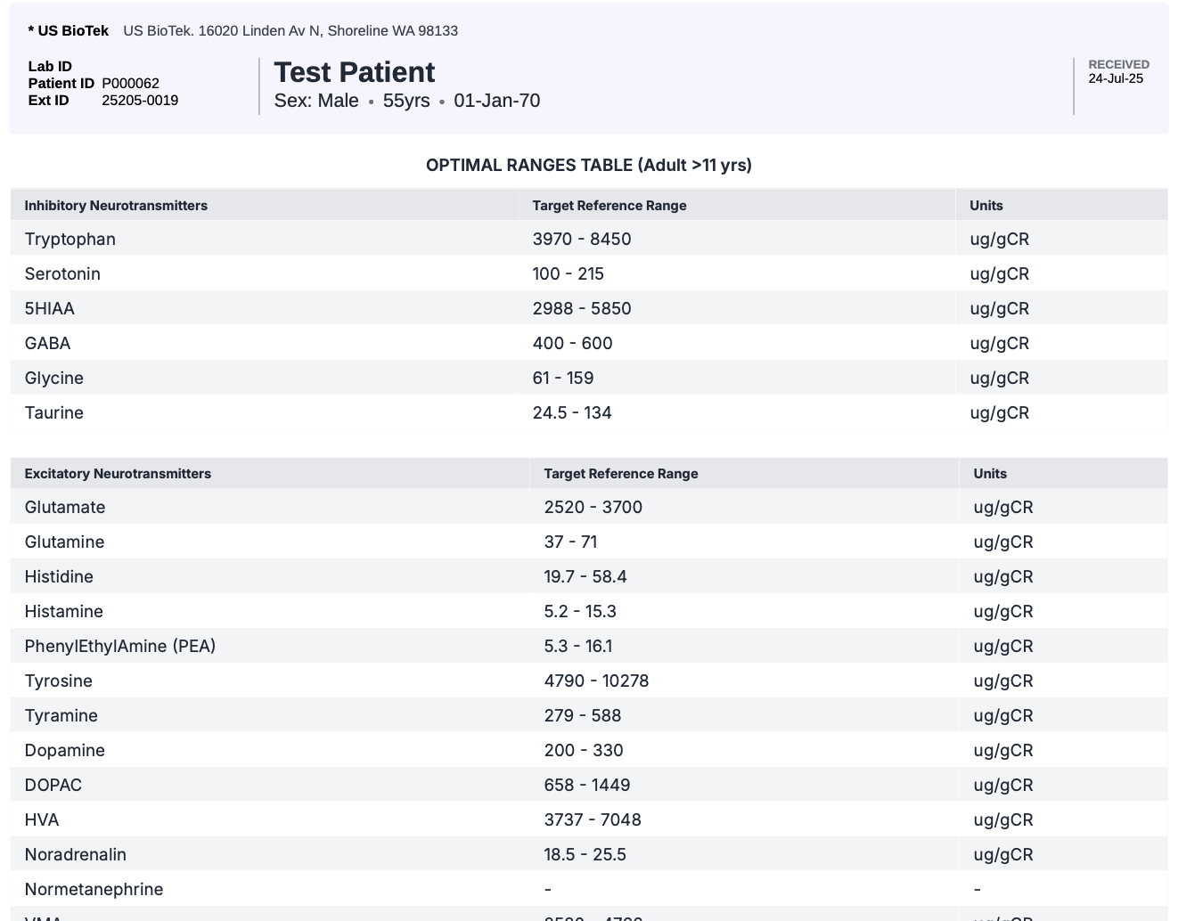 The Neurotransmitter-Advanced Profile is a four-point urine-based assessment that measures key neurotransmitters and metabolites involved in mood, sleep, cognition, and metabolic function. By evaluating patterns and ratios between markers, it provides insight into biochemical imbalances and their systemic effects. Utilizing liquid chromatography mass spectrometry (LC-MS/MS), the test delivers highly sensitive and precise quantification for accurate clinical interpretation, with correlation analysis to support targeted treatment and monitoring.
