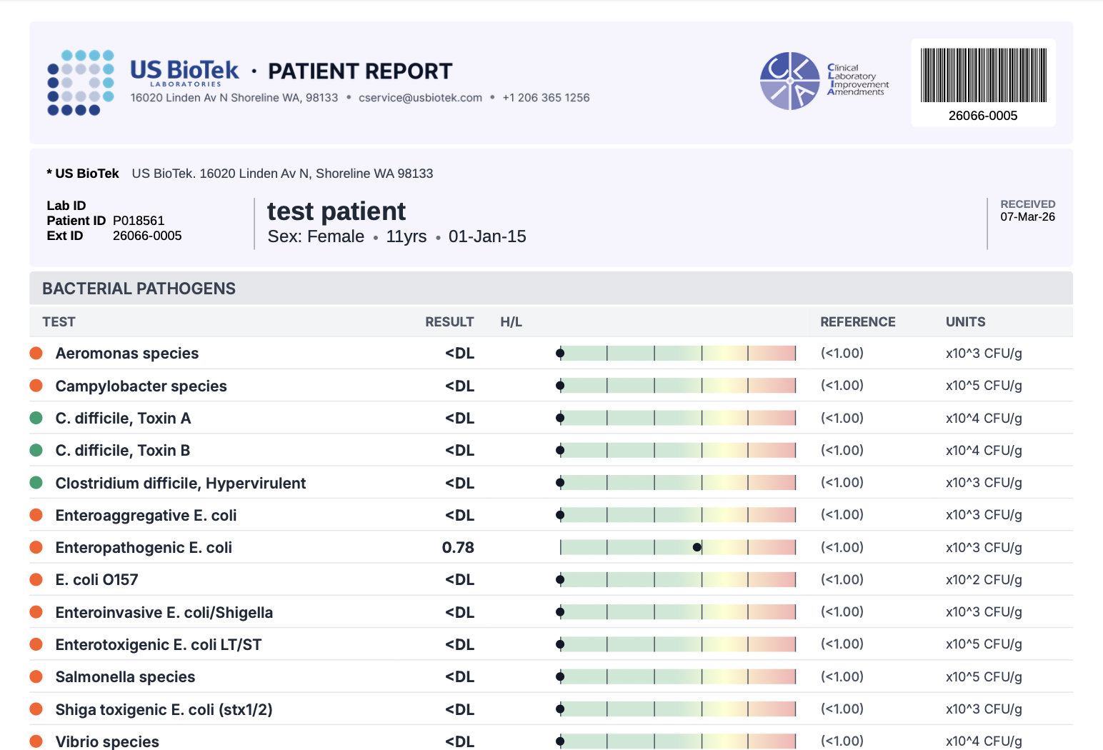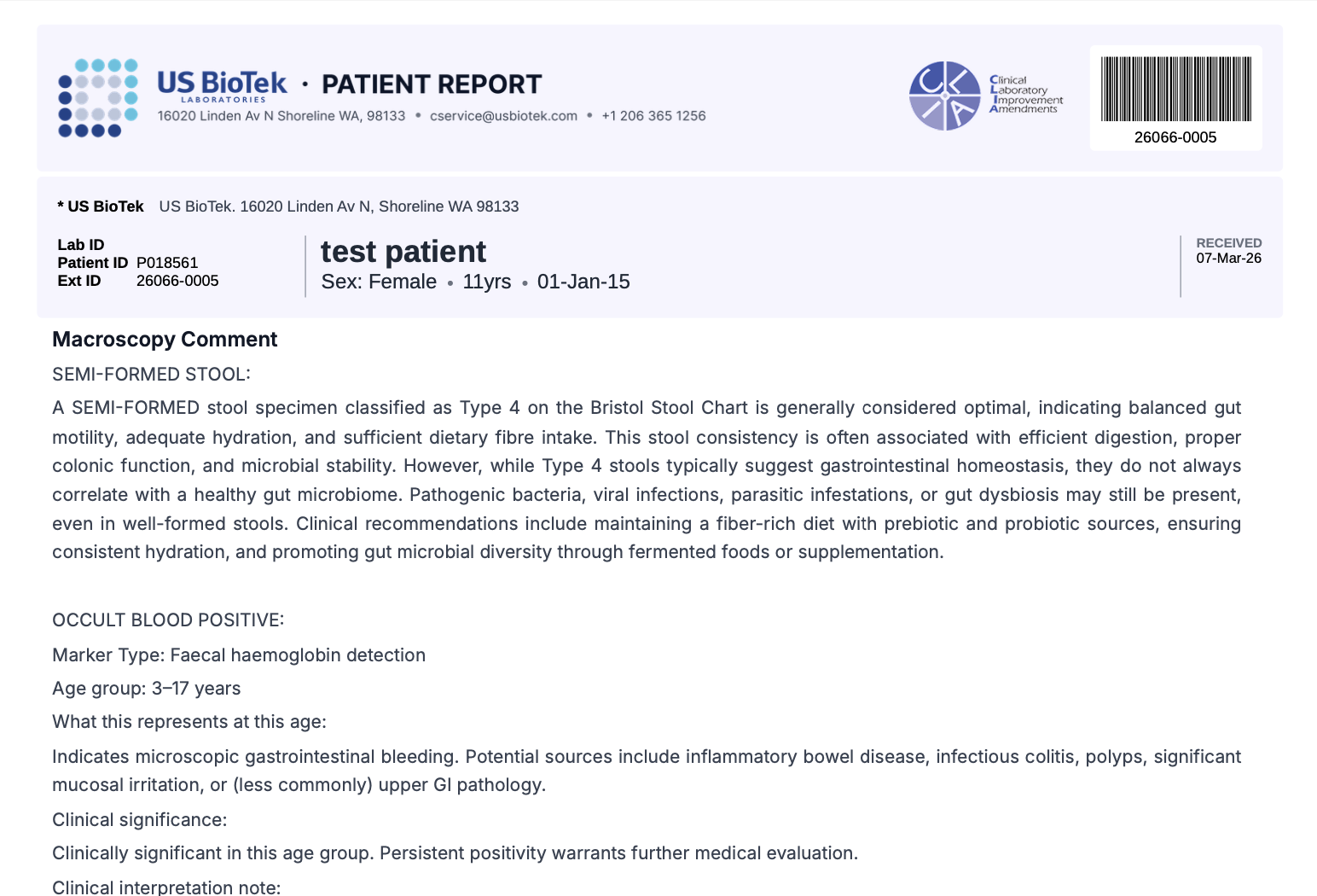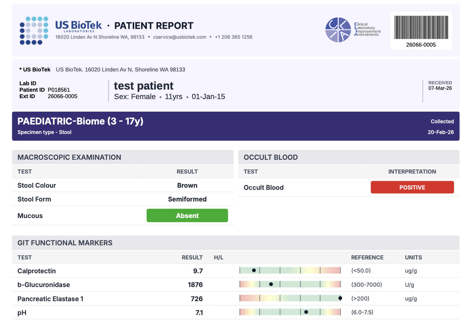 The PediatricBiome Profile is a comprehensive stool analysis for children and adolescents 3–17 years of age. Combining PCR and metagenomic (shotgun) sequencing technologies, it offers a broad view of gut health alongside age-specific reference ranges and personalized report commentary tailored to pediatric age groups.