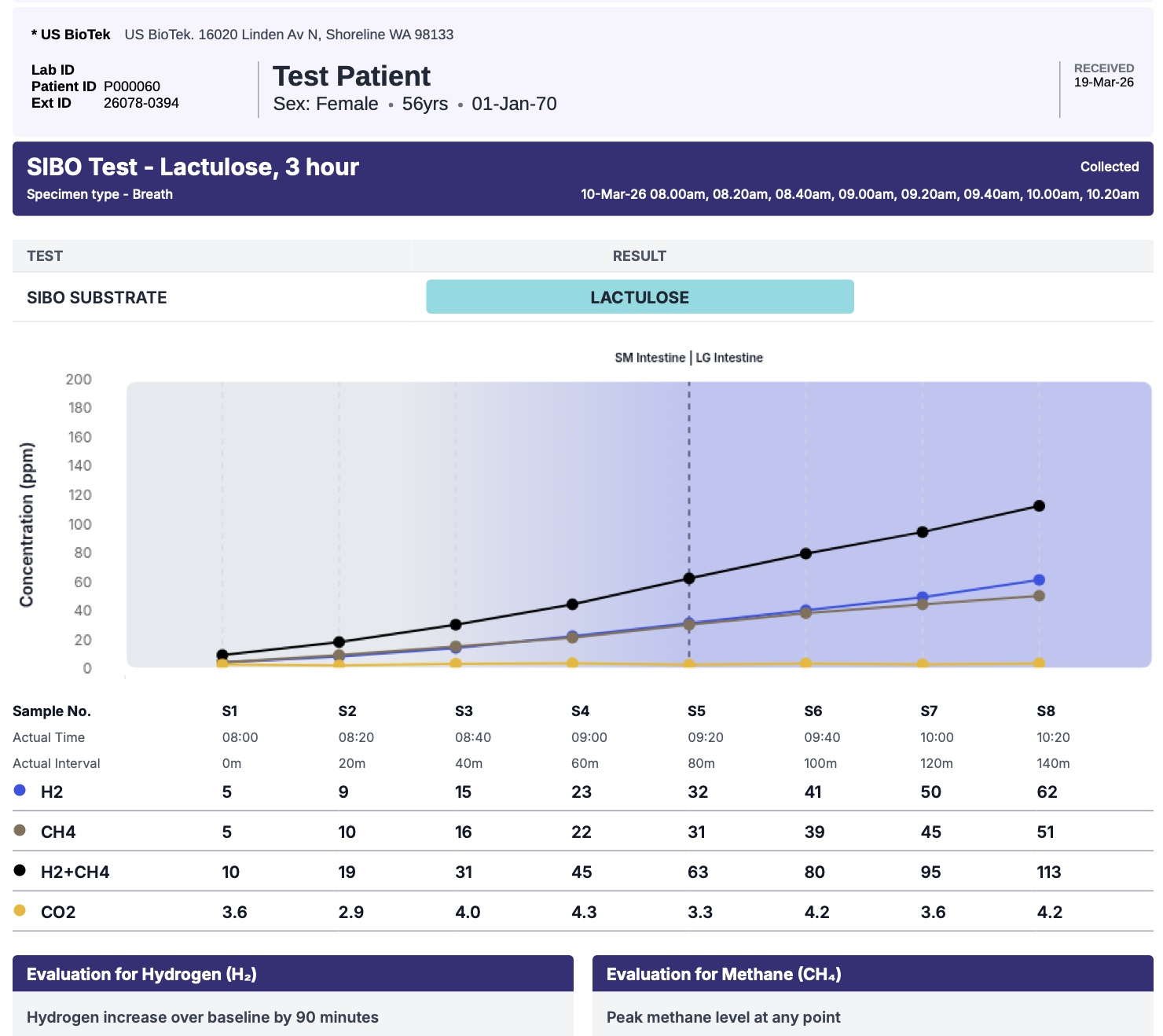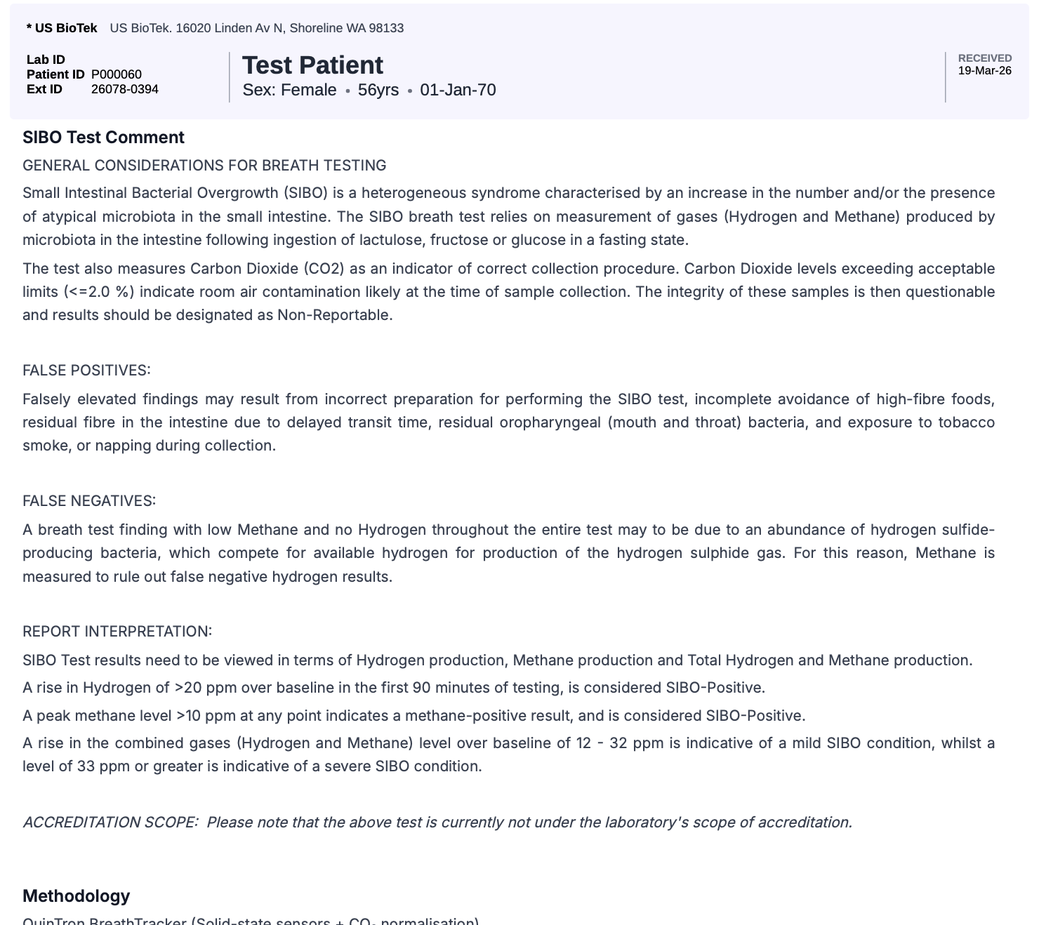 Using the QuinTron BreathTracker (solid-state sensors with CO₂ normalization), the test delivers highly sensitive and precise measurement of hydrogen and methane gases for accurate clinical interpretation.