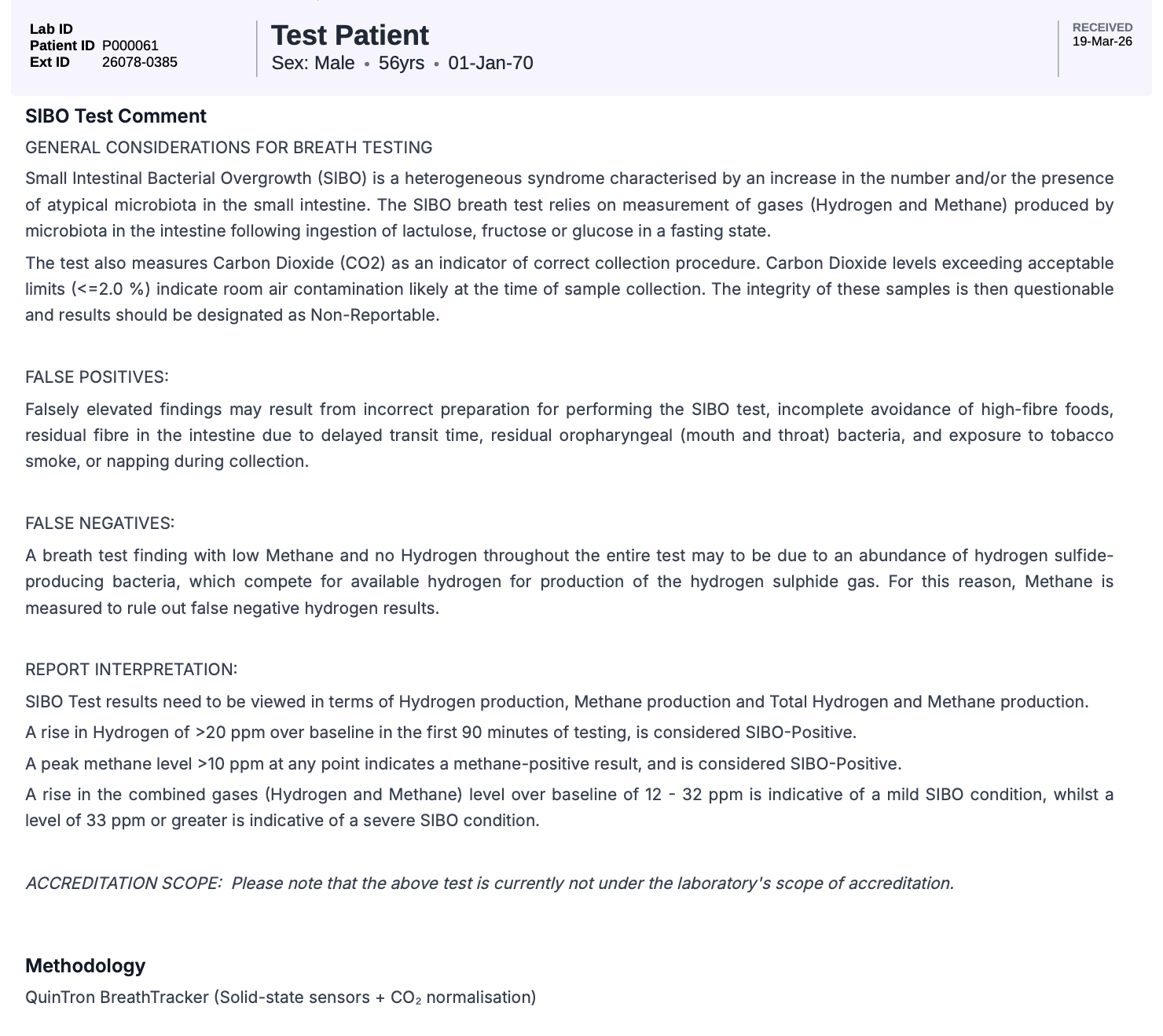 Using the QuinTron BreathTracker (solid-state sensors with CO₂ normalization), the test delivers highly sensitive and precise measurement of hydrogen and methane gases for accurate clinical interpretation.